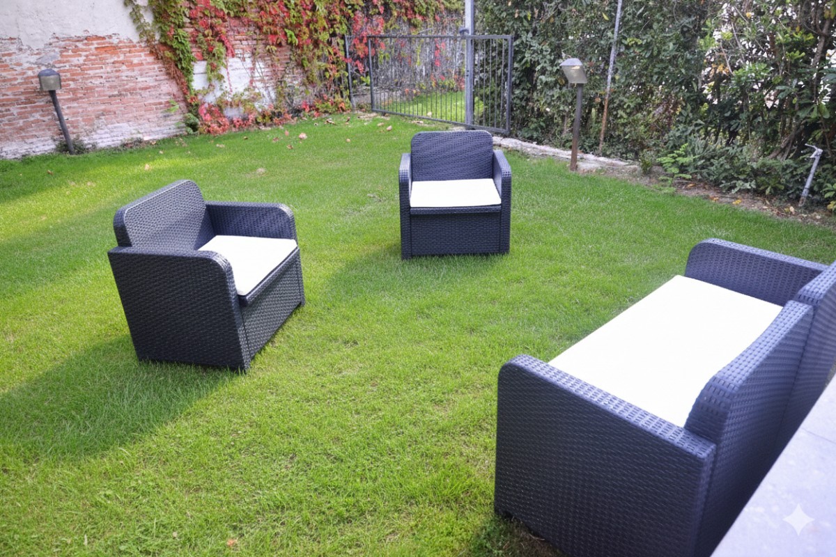 Spazio Esterno: Un giardino privato ad uso esclusivo, perfetto per colazioni all'aperto, cene estive o semplicemente per rilassarsi dopo una giornata in spiaggia.