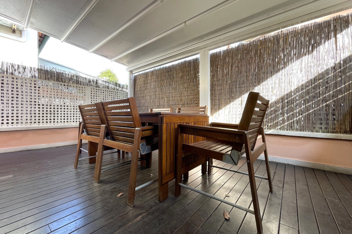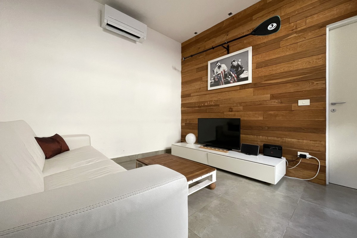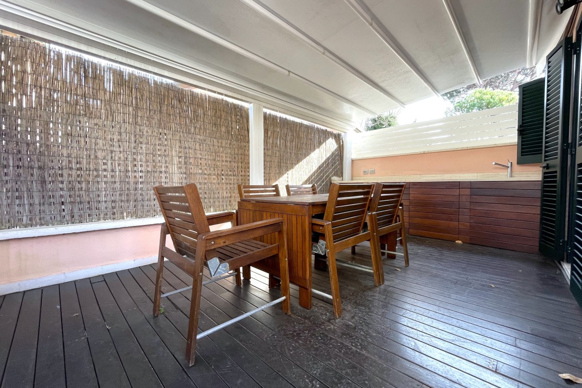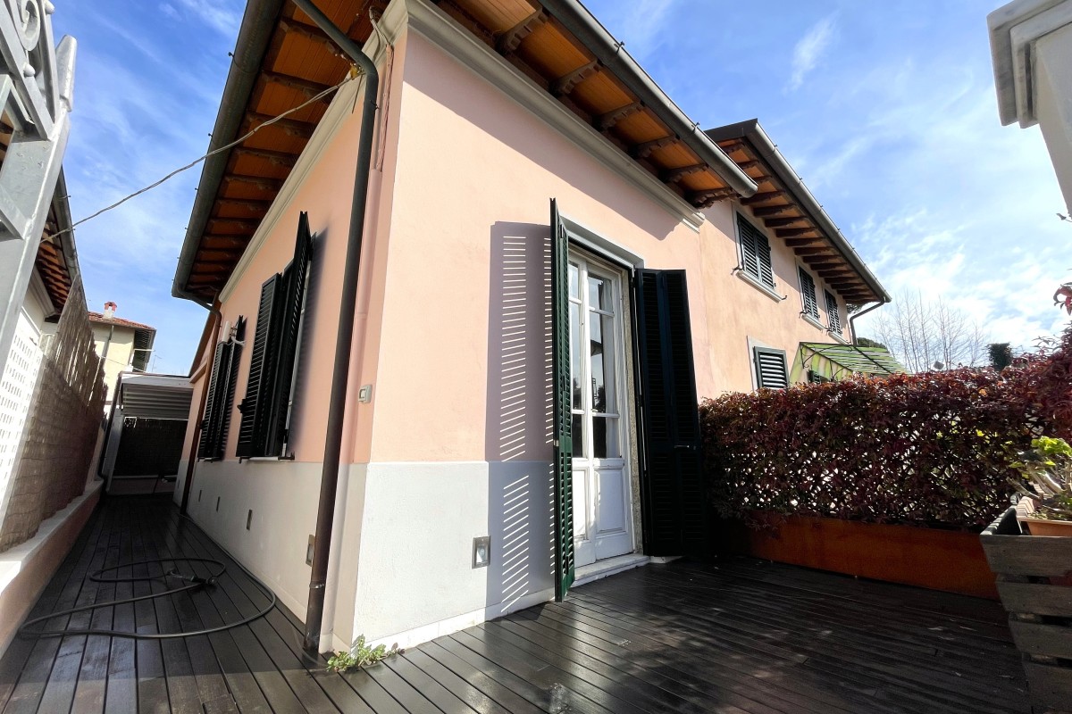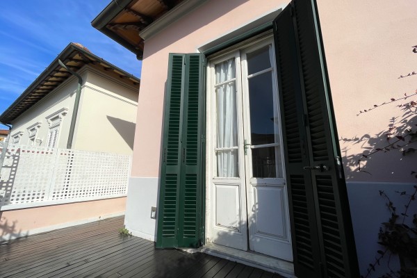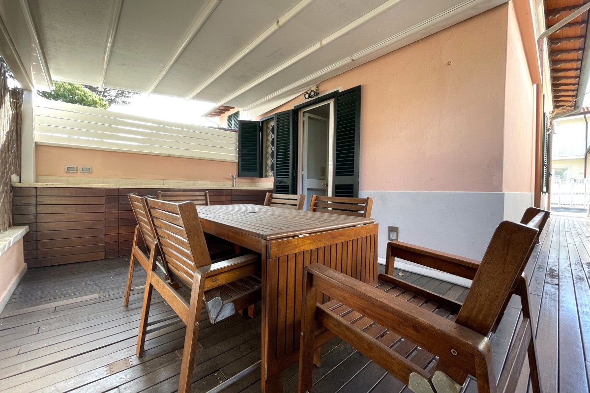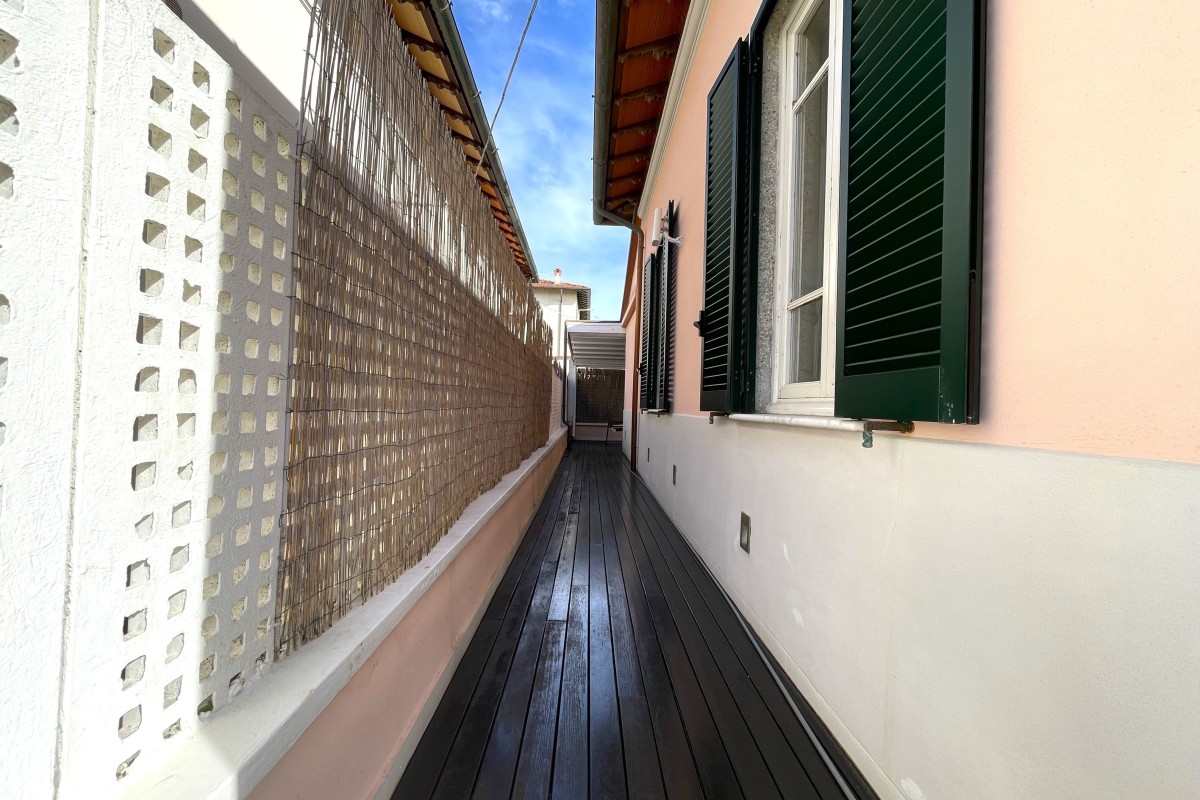 MARINA DI PIETRASANTA – Tonfano, 450 meters from the sea, portion of a newly built Viareggina-style house arranged on a single level, comprising: living room, kitchenette, bathroom, double bedroom, antechamber with one single bed, outdoor space with awning for outdoor dining, and entrance area for bicycles. Air conditioning.