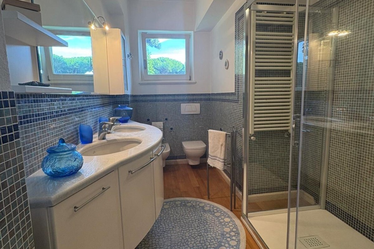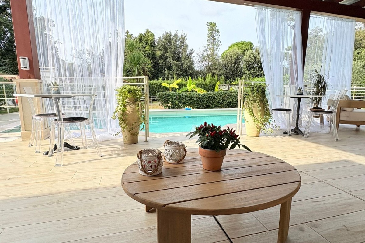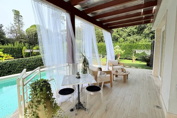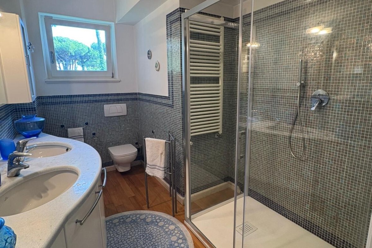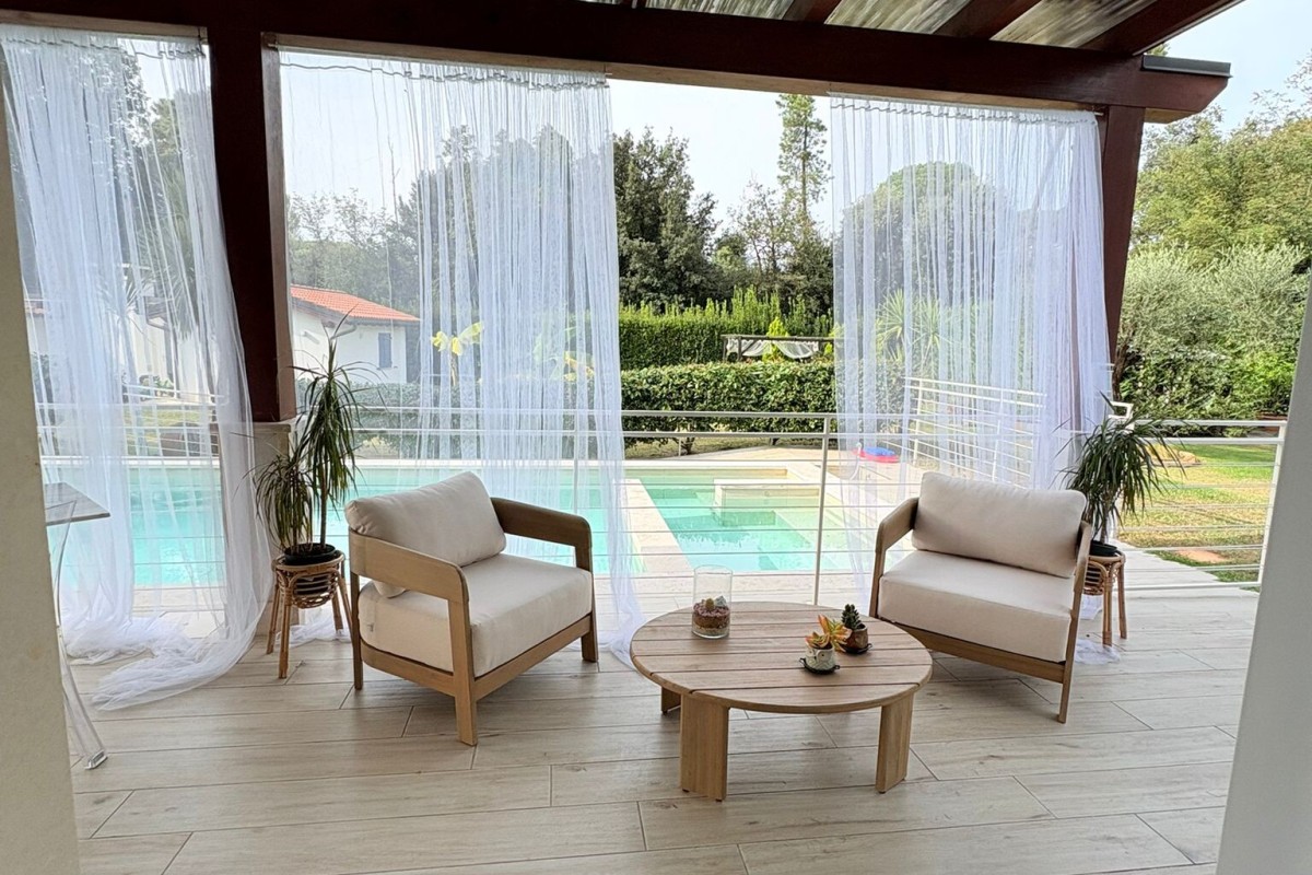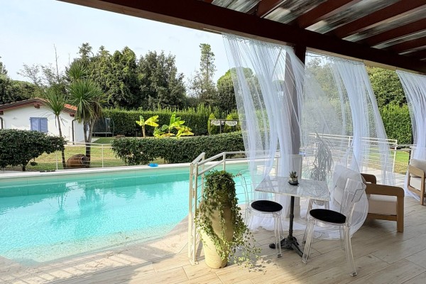 TRATTATIVE RISERVATE. Marina di Pietrasanta: 500 metri dal mare villa singola con piscina e 1200 metri di giardino disponibile, in affitto per la stagione estiva. Immobile di recente ristrutturazione dotato di tutti i comfort tra cui piscina, doppia cucina, aria condizionata in tutte le stanze, portico coperto abitabile per pranzi e cene all'aperto, grande giardino con gazebo, posti auto con possibilità di ricarica veicoli elettrici. L'immobile è composto a piano terra da soggiorno, sala da pranzo, cucina abitabile, 4 camere ognuna con il proprio bagno privato, zona lavanderia. Al primo piano troviamo una seconda cucina abitabile, zona giorno, terrazza con vista su giardino e due camere matrimoniali. La villa è dotata anche di un piano seminterrato con entrata indipendente nel quale è presente una camera con bagno. Completa la proprietà una dependance composta da soggiorno con angolo cottura, 1 camera matrimoniale, 1 cameretta, 2 bagni e lavanderia.