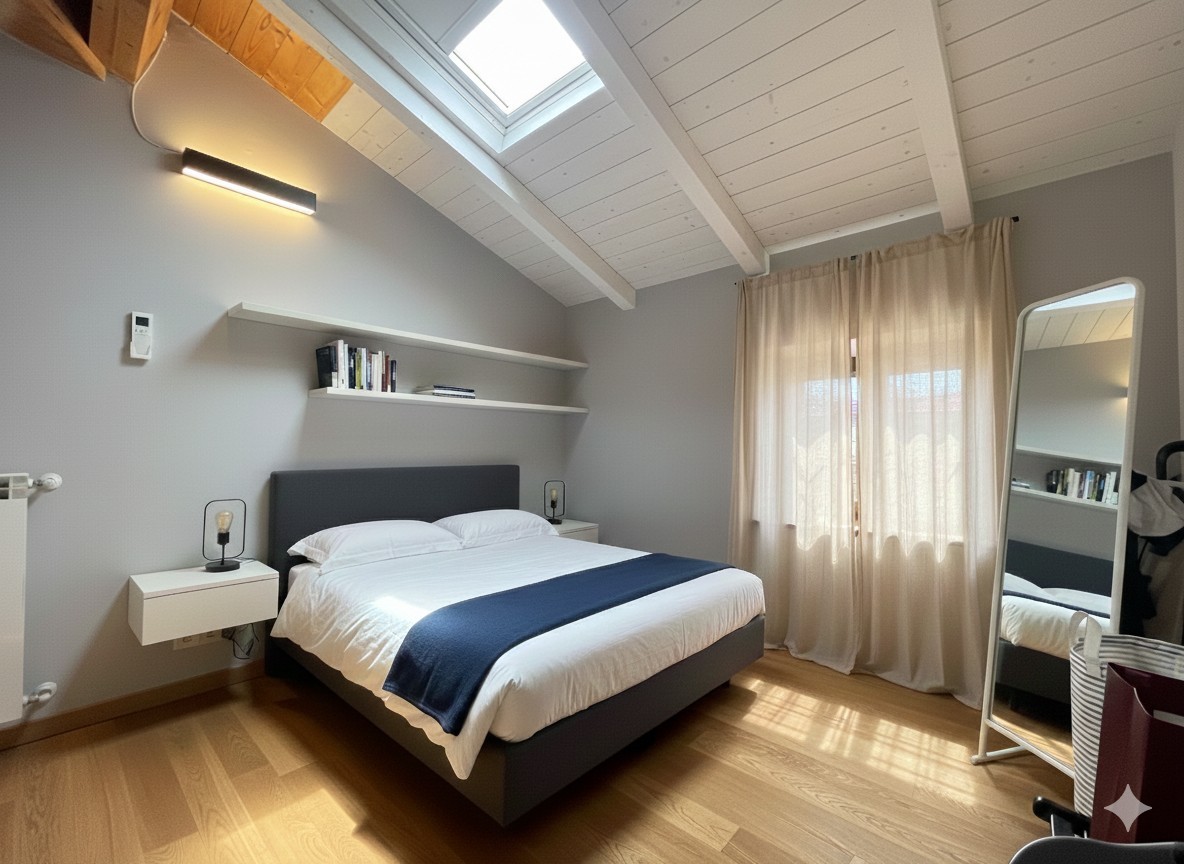 N.B. Alcune immagini di questo immobile, pubblicate sul sito e sui portali immobiliari, hanno finalità puramente dimostrative. Esse mostrano gli spazi esistenti mantenendo la stessa distribuzione e gli stessi pavimenti; nelle simulazioni viene modificato il colore dei soffitti, applicata una resina al rivestimento del bagno e rinnovato l’arredamento degli ambienti. Tali immagini servono esclusivamente a illustrare come l’immobile possa assumere un aspetto più gradevole e contemporaneo con interventi minimi e la semplice sostituzione degli arredi.