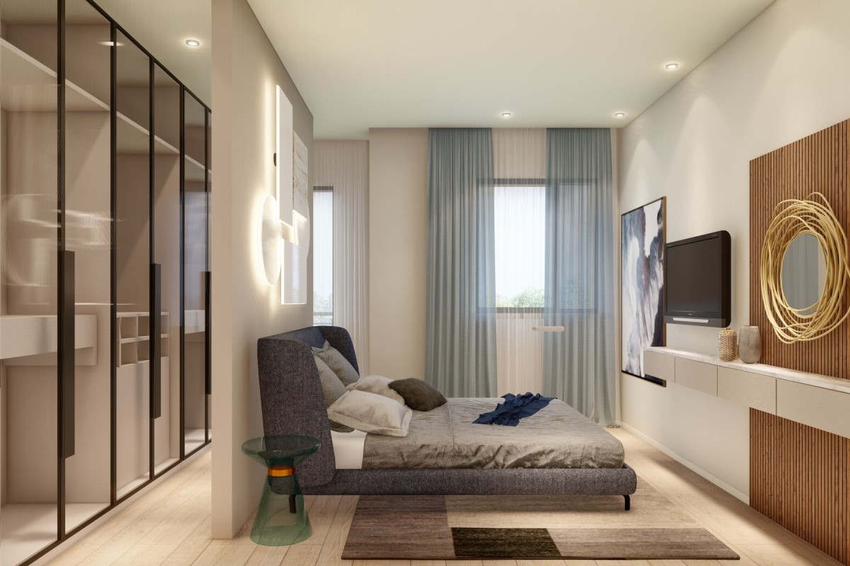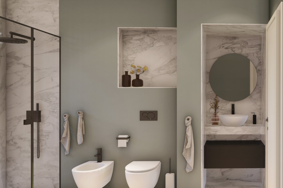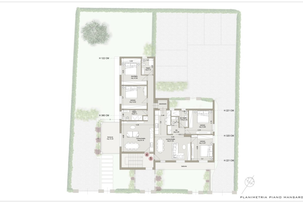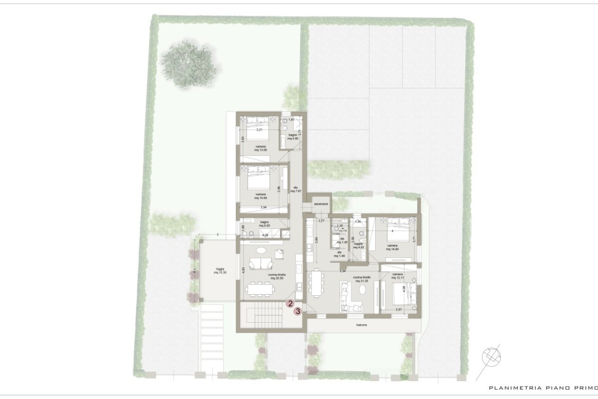 Il complesso è costituito da 6 unità immobiliari disposte su 3 livelli in totale. Al piano terra sono presenti appartamenti con giardini privati, mentre i piani superiori – serviti da ascensore – offrono ampie terrazze abitabili o balconi vivibili.