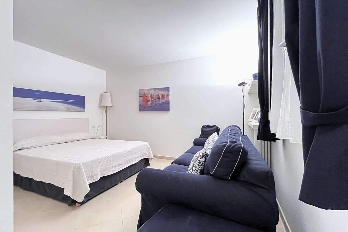 Piano terra: luminoso soggiorno, zona pranzo con angolo cottura, camera e bagno, e terrazza.