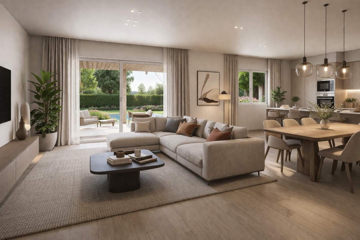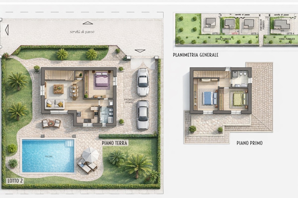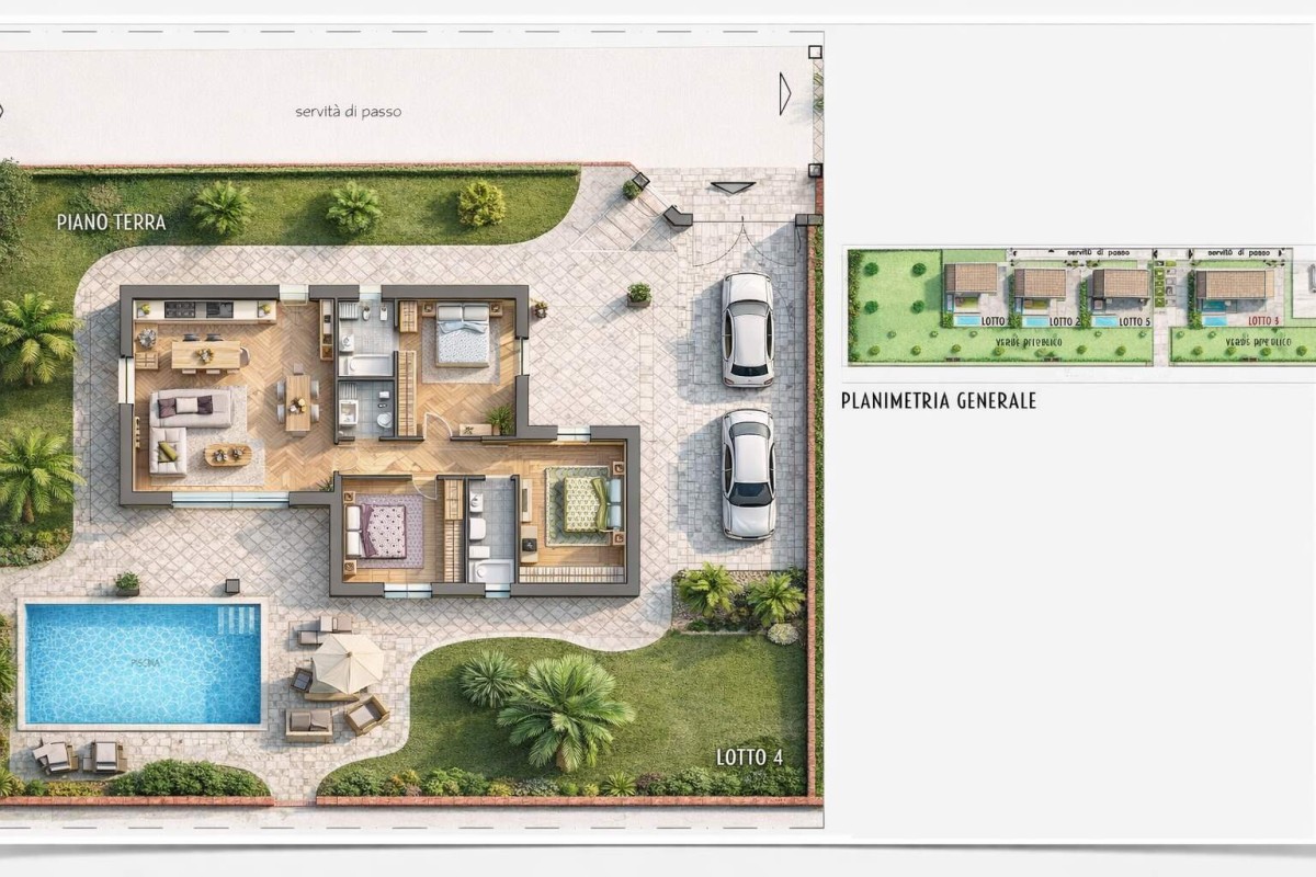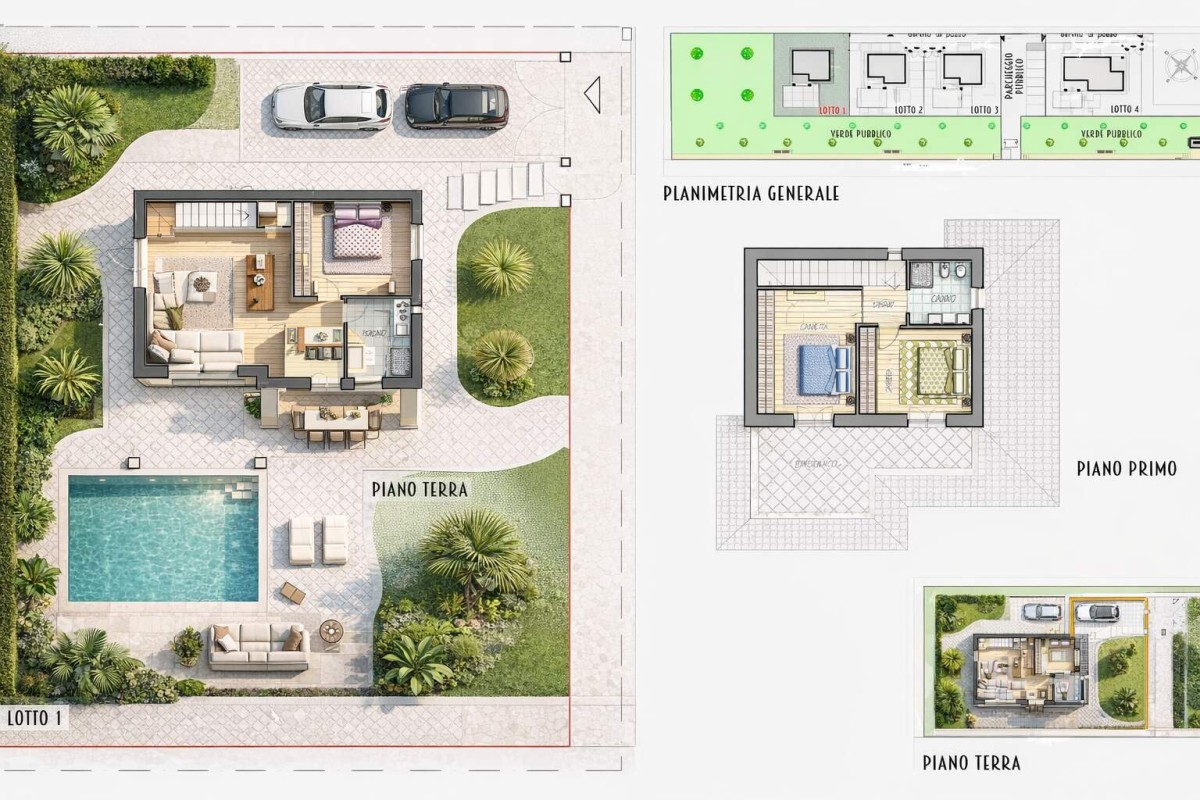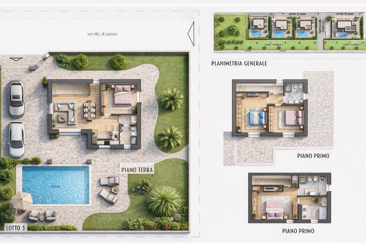 rialzato: ingresso, soggiorno, cucina e zona pranzo, tre camere matrimoniali,