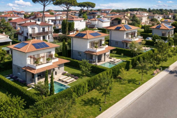 due bagni. Terrazza su tre lati. Taverna: ampio soggiorno, cucina, due camere